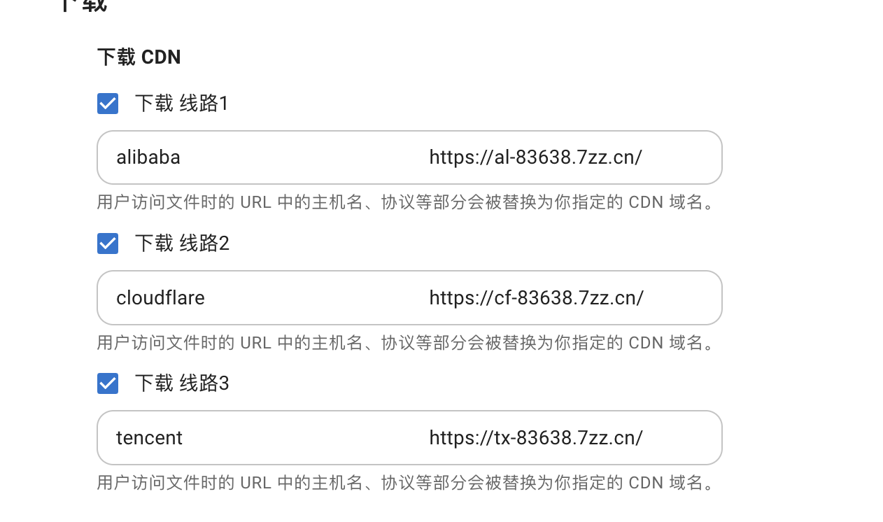 例如:管理员可在后台配置多个CDN下载地址(如线路一、线路二、线路三)。